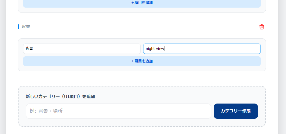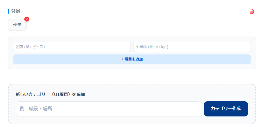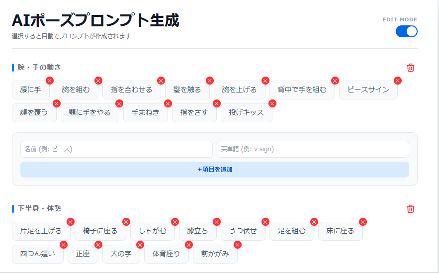 あらかじめ登録されているポーズに加え、あなたが普段使っているプロンプトを「編集モード」から簡単に追加できます。衣装、場所、画風など、カテゴリーごと自由に増やせるため、使えば使うほどあなたにとって最強のツールになります。
